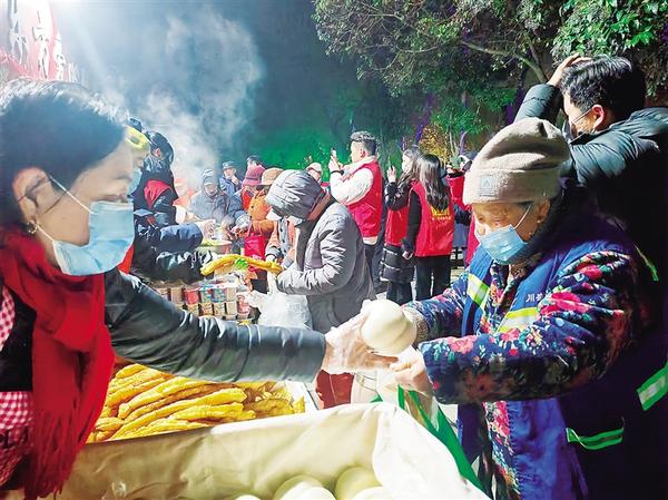 1月18日早上,在中心城区东方爱心粥屋,志愿者为环卫工人送上热气腾腾的早餐。当天是中国传统节日腊八节,5时许,东方爱心粥屋的志愿者开始发放早餐。盛腊八粥、拿油条、发鸡蛋……志愿者们动作娴熟。160多名环卫工人吃着热气腾腾的饭菜,驱散了冬日的寒冷。