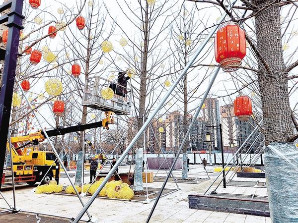 1月21日,施工人员在周口关帝庙广场悬挂彩灯。周口作为今年“春满中原·老家河南”活动的主会场之一,将于1月30日至2月25日举办首届“三川十馆·春会”。主办方在关帝庙广场、人和街、富强街、茶街、渡口广场等处的树上、灯杆上悬挂了1万多盏灯笼,营造浓郁的节日氛围。 记者 王吉城 摄