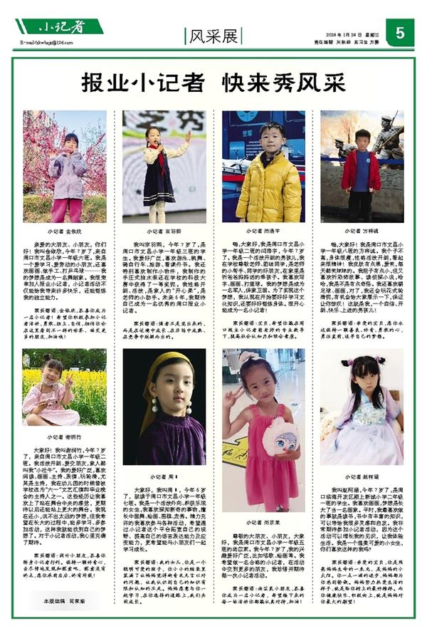 小记者 金依欣 亲爱的大朋友、小朋友,你们好!我叫金依欣,今年7岁了,来自周口市文昌小学一年级六班。我是一个爱学习、爱劳动的小朋友,还喜欢画画、做手工、打乒乓球………我的梦想是成为一名舞蹈家。我很荣幸加入报业小记者,小记者活动不仅能给我带来许多快乐,还能锻炼我的独立能力。 家长寄语:金依欣,恭喜你成为一名小记者!希望你积极参加小记者活动,勇敢、独立、自信,相信你会在这里看到不一样的世界、结交更多的朋友,加油哦!