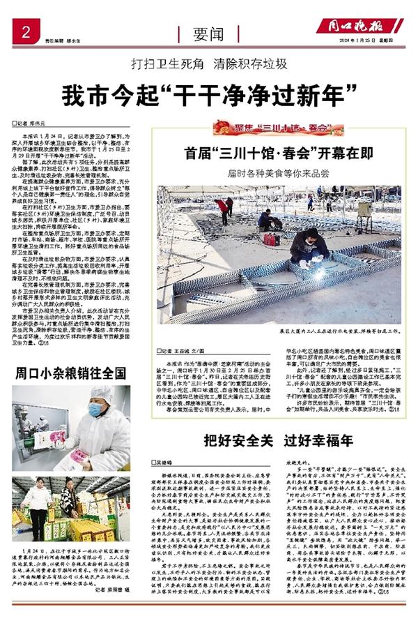 1月24日,在位于市城乡一体化示范区搬口街道贾寨行政村的河南翔耀食品有限公司,工人正紧张地装袋、分拣,以便将小杂粮及面粉制品运送全国各地,满足消费者春节期间的需求。作为地方知名企业,河南翔耀食品有限公司以本地农产品为依托,生产的杂粮达三四十种,畅销全国各地。