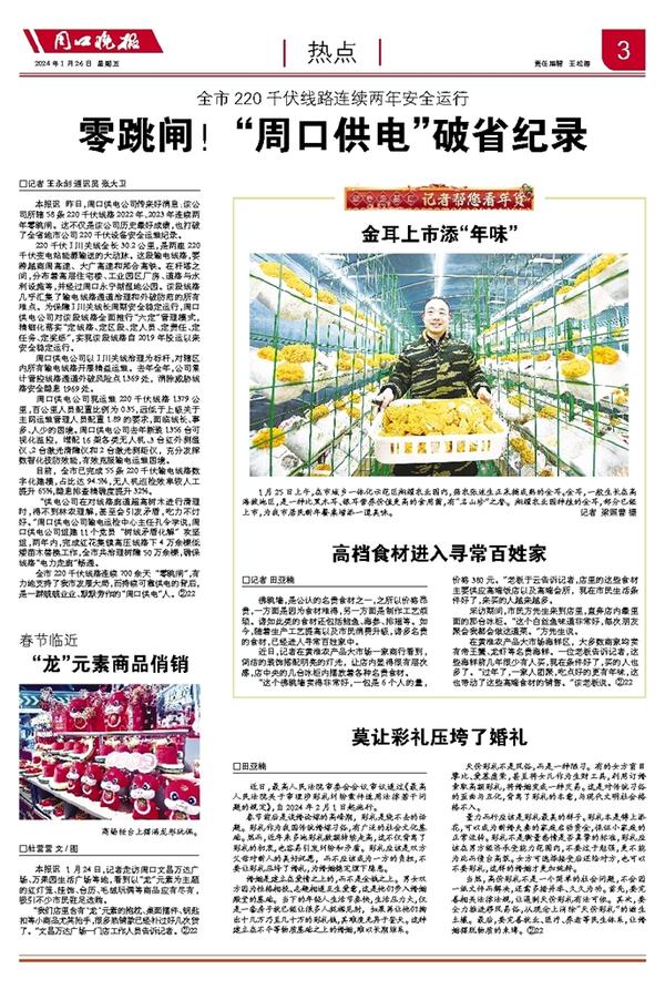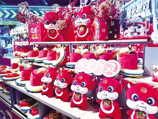 本报讯 1月24日,记者走访周口文昌万达广场、万果园生活广场等地,看到以“龙”元素为主题的红灯笼、挂饰、台历、毛绒玩偶等商品应有尽有,吸引不少市民驻足选购。
