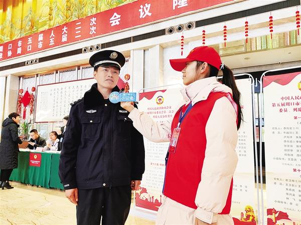 2月1日,周口报业小记者王怡迪采访两会期间的执勤人员。为提升广大市民对周口两会的关注度,扩大新闻宣传的互动性、影响力,两会期间,经过层层选拔的8名周口报业小记者以特殊的“新闻工作者”身份,手持话筒,与人大代表、政协委员面对面交流,以青少年的视角看两会。 两会期间,周口报业小记者还会采访为两会提供服务保障的消防救援、医疗救护等部门工作人员,同时记录两会期间的新鲜事、感人事。③2 王俊祥 摄