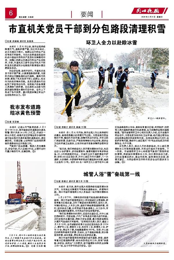 扫出安全路,助民平安行。市直机关党员干部不畏严寒,认真清理路面积雪,为居民开辟出平整畅通的出行道路,赢得市民称赞,展现了机关党员干部心系群众、担当作为的良好精神风貌。党员志愿者的行动起到了积极带动作用,沿街商户自备清雪工具清除门前积雪,社区居民主动参与到居民楼院清理冰雪的行动中来,全市上下形成了各尽其责、最大限度保障正常生产生活秩序的合力。③2