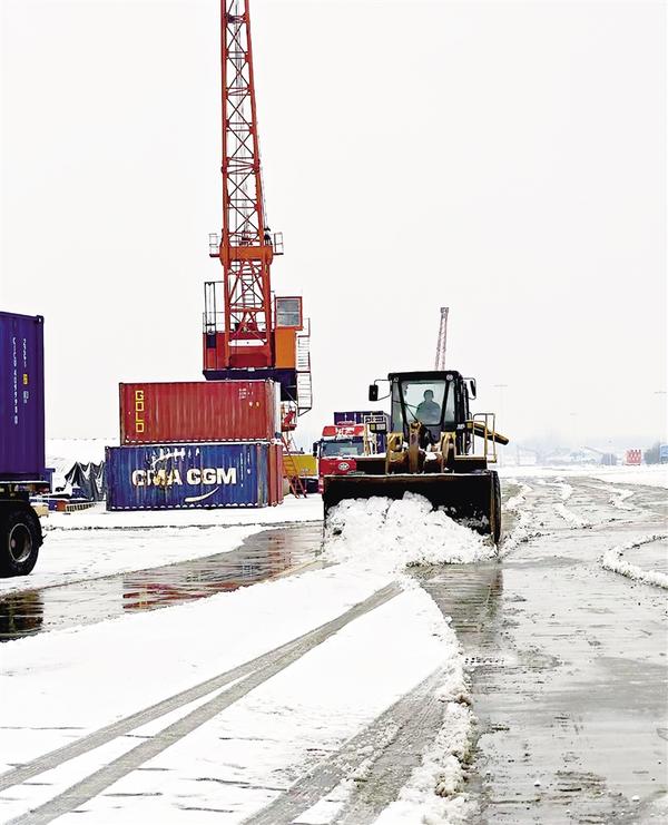 2月3日,周口中心港因积雪无法开展作业,几十辆集卡车在港口外无法进港。该港运营事业部全体员工与客户通力合作,通过铲车铲雪、人工清雪、撒布工业盐等多种方法,保障道路畅通。③2记者 王永剑 摄
