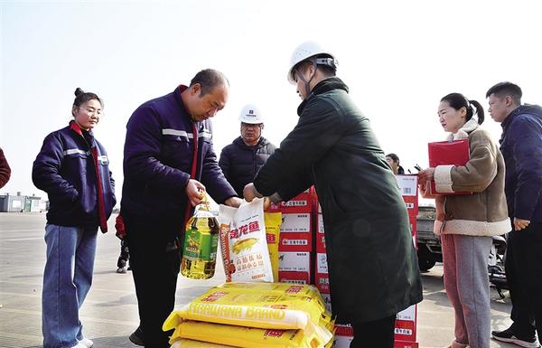 2月8日上午,在周口中心港,船老大们领取慰问品。当天,河南水投兴洲港务有限公司准备了大米、方便面、面粉、食用油等,慰问港口一线作业人员、客户、在港船民,感谢他们的辛勤付出。据了解,因多种原因,有几十艘外地货船停泊在周口中心港,船老大们要在船上过年。 记者 梁照曾 摄