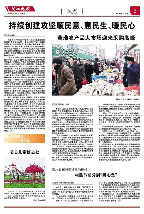年货市场火热,客流量增多,维护市场秩序和消费安全至关重要。为此,黄淮农产品大市场将物流配货区改成顾客停车区,方便市民停车。此外,100余名工作人员在市场内维持秩序,确保道路畅通。“我们采用线上备案审核加线下抽查的方式,确保进入市场内的食用农副产品质量安全,同时定期抽查包装类食品,设置公平秤,坚决打击‘三无’、过期、假冒产品。”黄淮农产品大市场相关负责人表示。②22