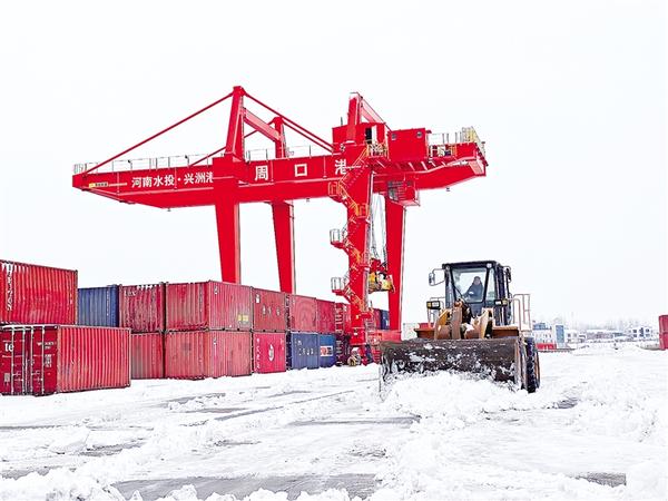 为做好低温雨雪冰冻灾害的防范应对,连日来,周口港中心港作业区组织人员和车辆对出入港主干道进行破冰除雪,护航港口安全生产。记者 宋风 摄