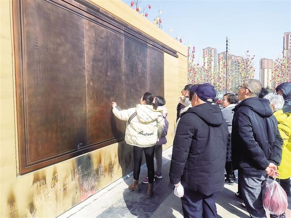 2月26日,一群游客在关帝庙照壁前驻足观看。此照壁为关帝庙历史街区新建的配套项目,两面为紫铜,雕刻有周口相关历史信息,集实用性与观赏性于一体,引得群众纷纷前来打卡。记者 沈湛 摄