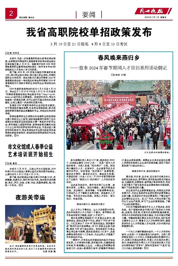 本报讯 为进一步完善高职院校分类考试招生制度,全面落实河南省深化普通高等学校考试招生综合改革实施方案,2月28日,省教育厅发布2024年河南省高等职业教育单独考试招生(简称高职单招)和技能拔尖人才免试入学工作政策。
