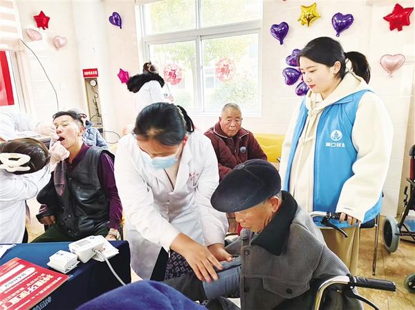 3月5日,周口德正医院医务人员为老人测量血压。为弘扬雷锋精神,引领健康风尚, 当日,太昊路街道社工站联合周口德正医院,到周口市老年护理院开展“践行雷锋精神,社工与你同行”健康义诊志愿活动。③5杜林波 摄