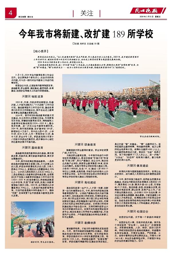教育是社会的热点。“办人民满意的教育”是庄严承诺,所以要在行动上全力落实。2023年,我市建设教育强市三年行动计划、建设体育周口的系列文件相继出台,由此迈上教育体育事业高质量发展新征程。