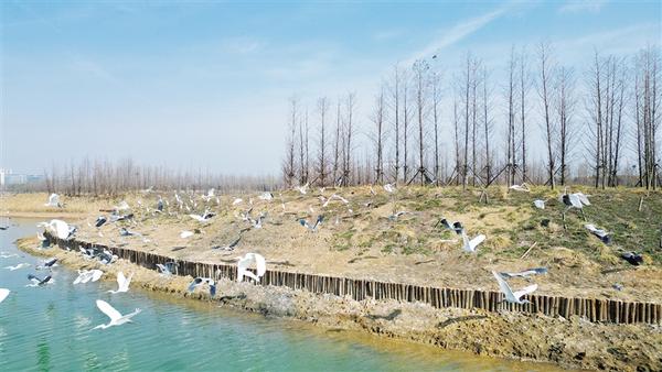 眼下,正值春暖花开、草长莺飞之季。3月10日上午,大批水鸟翱翔在波光粼粼的引黄调蓄工程水域,或嬉戏盘旋,或入水捕食小鱼。 记者 梁照曾 摄