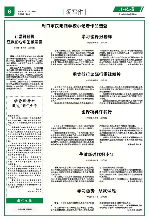 同学们,让我们一起行动起来,学习雷锋精神,争做新时代的好少年,让我们的生活更加美好,让我们的社会更加和谐。我相信,只要每个人都尽一份力,我们的社会一定会变得更加美好!(辅导老师:孙成荣)
