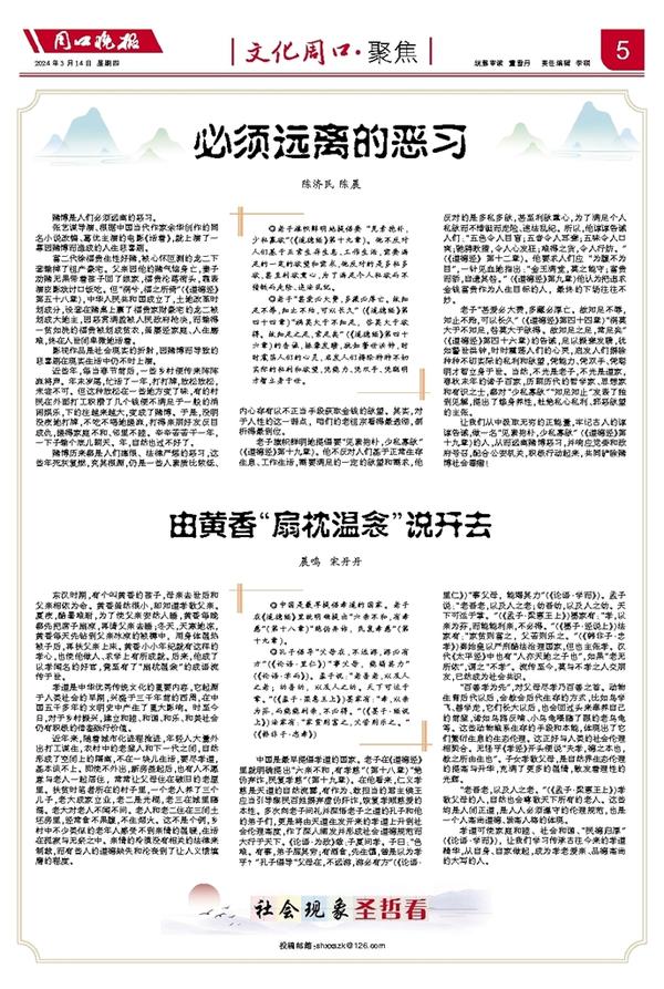 孝道可使家庭和睦、社会和谐、“民德归厚”(《论语·学而》),让我们学习传承古往今来的孝道精华,从自身、自家做起,成为孝老爱亲、品德高尚的大写的人。