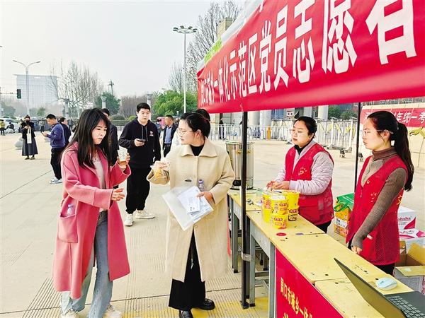 在周口文理职业学院考点,周口市城乡一体化示范区组织党员志愿者早早来到“党员志愿者服务点”。“我们统一配备了文具、饮用水、面包等。”党员志愿者卢柏颖说,考虑到个别考生可能忘记打印准考证,他们还为考生提供准考证打印服务。