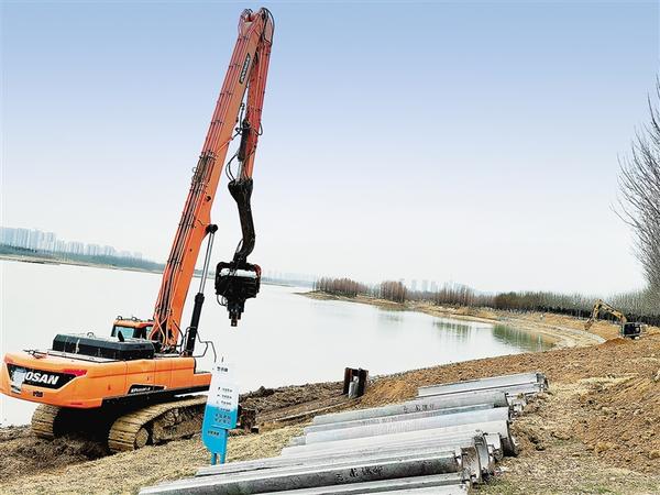 3月21日上午,施工人员驾驶挖掘机对引黄调蓄工程堤岸进行加固。据了解,由于湖水不断侵蚀,引黄调蓄工程沿岸存在安全隐患。近日,市城乡一体化示范区对引黄调蓄工程堤岸进行加固,为市民提供一个安全美丽的休闲地。记者 梁照曾 摄