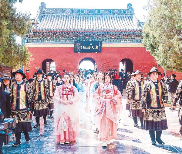 3月22日上午,50余名身着古装的年轻姑娘和小伙儿亮相太昊陵景区,引得众多游客纷纷举起手机拍照。 据模特表演队相关负责人介绍,为助力在淮阳区举办的第二届周口伏羲书展和书香周口建设,周口交通技师学院百余名师生参与了书展的多项志愿服务宣传工作。该校学生十分珍惜这次研学活动,以最佳状态连续进行多场汉服巡演,为游客奉上精美的文化大餐。记者 王吉城 摄