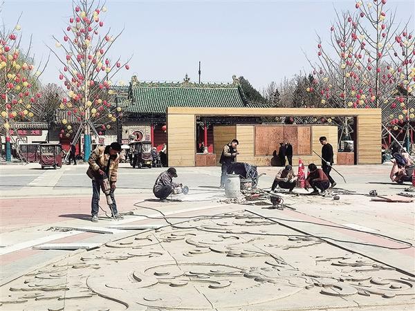 近日,维修工人在关帝庙文化广场整修地面。周口首届“三川十馆·春会”结束后,有关部门对春会期间关帝庙文化广场损坏的路面进行整修,摘除树上悬挂的灯具,投入后期管理工作。记者 沈湛 摄