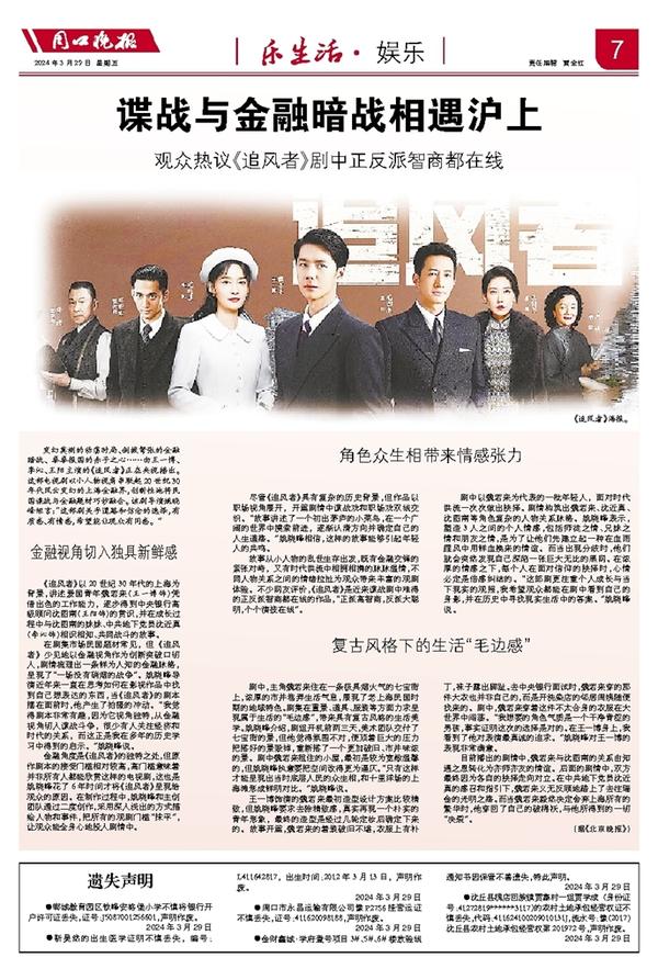 变幻莫测的动荡时局、剑拔弩张的金融暗战、拳拳报国的赤子之心……由王一博、李沁、王阳主演的《追风者》正在央视播出。这部电视剧以小人物视角串联起20世纪30年代风云变幻的上海金融界,创新性地将民国谍战与金融题材巧妙融合。该剧导演姚晓峰坦言:“这部剧关乎道路和信念的选择,有质感、有情感,希望能让观众有同感。”