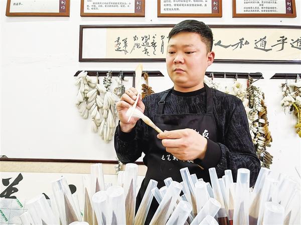 昨日,鹿邑县散卓毛笔制作技艺传承人刘永杰在工作室精心制作毛笔。他是该项目非遗传承人,曾被评为“周口大工匠”。散卓毛笔制作工艺复杂,从选料到成品,需要大小工序80多道,耗时8天左右,被誉为毛笔中的精品。记者 付永奇 摄