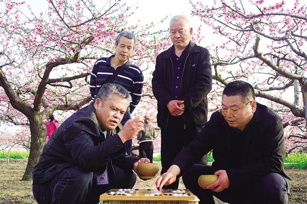 3月30日下午,来自辽宁丹东的何志强(左)和周口棋友吕建文在西华县黄桥乡裴庄村桃园里花下对弈,吸引棋友观战。当天下午,参加河南省第二届“桃花杯”业余围棋公开赛的棋手在组委会的组织下,到西华县黄桥乡裴庄村游玩。记者 梁照曾 摄