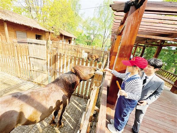 小记者和家长走进该校牡丹园,他们纷纷拿出手机,记录下这迷人的美景。之后,大家又来到该校的萌宠乐园,羊驼、孔雀、矮马、鸵鸟、黑天鹅等动物吸引了大家的目光,有的小记者还拿出黄瓜、胡萝卜等食物,对它们进行投喂。