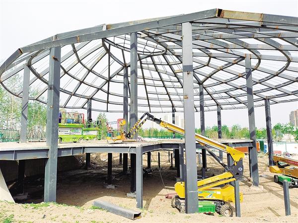4月17日,几台施工机械正在市民驿站施工现场作业。正在施工的这座市民驿站坐落于关帝老街东南部,为两层钢架结构,投入使用后可为市民提供休憩观光等便利服务。记者 沈湛 摄