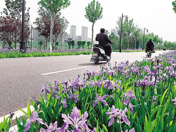 4月17日,行人经过开满扁竹花的滨河公园八一大道至大庆路段。扁竹花为鸢尾科多年生草本植物,花期约60天,是适合绿化观赏的景观植物之一。 记者 沈湛 摄