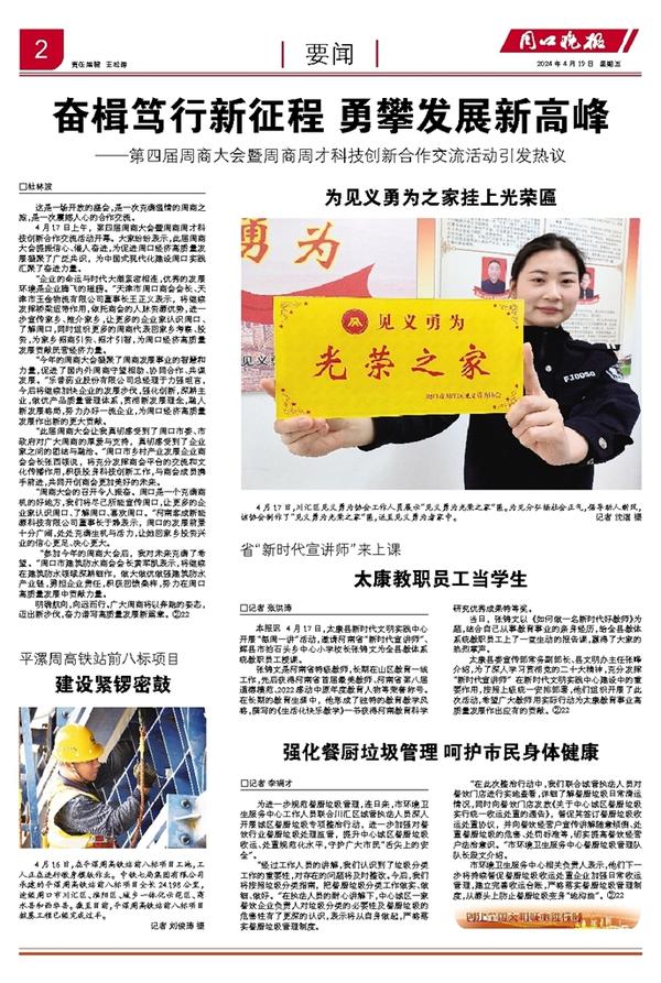 “企业的命运与时代大潮紧密相连,优秀的发展环境是企业腾飞的翅膀。”天津市周口商会会长、天津市玉金物流有限公司董事长王正义表示,将继续发挥桥梁纽带作用,依托商会的人脉资源优势,进一步宣传家乡、推介家乡,让更多的企业家认识周口、了解周口,同时组织更多的周商代表回家乡考察、投资,为家乡招商引资、招才引智,为周口经济高质量发展贡献民营经济力量。