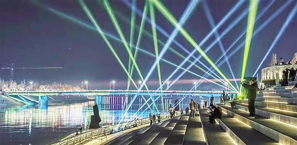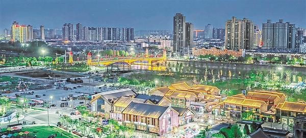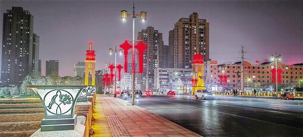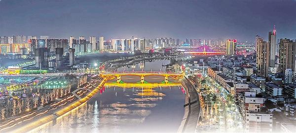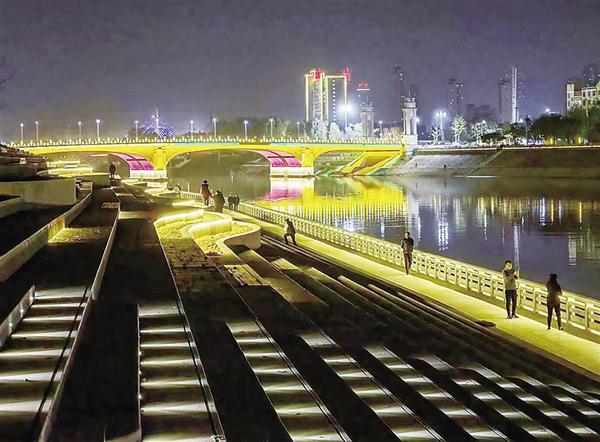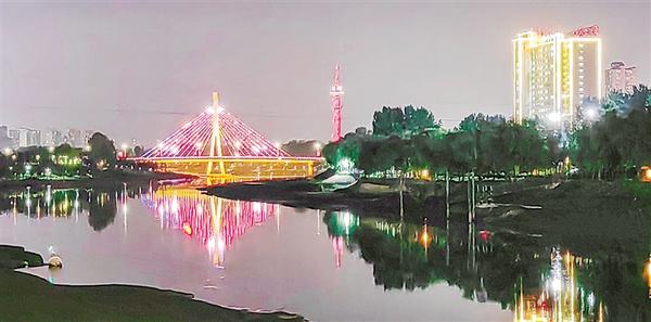 沙颍河是周口的母亲河。每到夜幕降临,中心城区沙颍河两岸灯光璀璨,沿河几座桥上的灯饰美不胜收,夜晚的沙颍河畔成为市民休闲娱乐的好去处。看到家乡日新月异的变化,作者不禁拿起手机,记录下这美好的夜景。③2