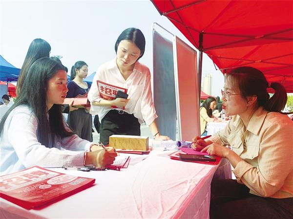 4月20日,一名高校毕业生在招聘会上了解岗位信息。当天,“‘职’在周口、‘才’有未来”2024年在周高校毕业生专场招聘会在市体育中心广场举行,近400家用人单位参与招聘,提供岗位涵盖工业、教育、医疗、商贸物流等领域。杜林波 摄