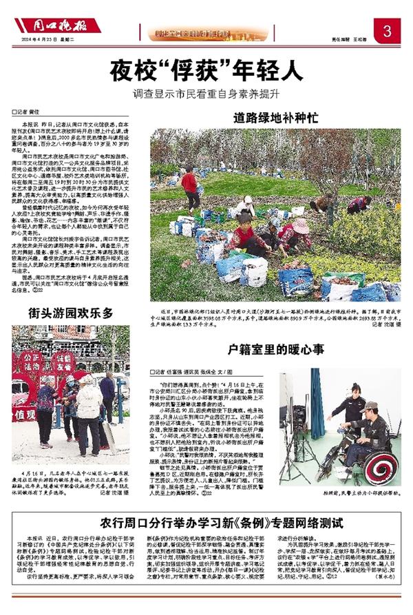 近日,市园林绿化部门组织人员对周口大道(沙颍河至七一路段)西侧绿地进行绿植补种。据了解,目前我市中心城区绿化覆盖面积3598.08万平方米,其中,道路绿地面积890.9万平方米,公园绿地面积2693.88万平方米,生产绿地面积13.3万平方米。记者 沈湛 摄