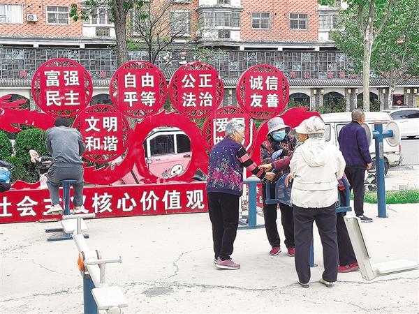 4月16日,几名老年人在中心城区七一路东段康湾社区街头游园内锻炼身体。他们三五成群,其乐融融。近年来,随着城市配套设施逐步完善,老年朋友休闲锻炼有了更多选择。记者 沈湛 摄