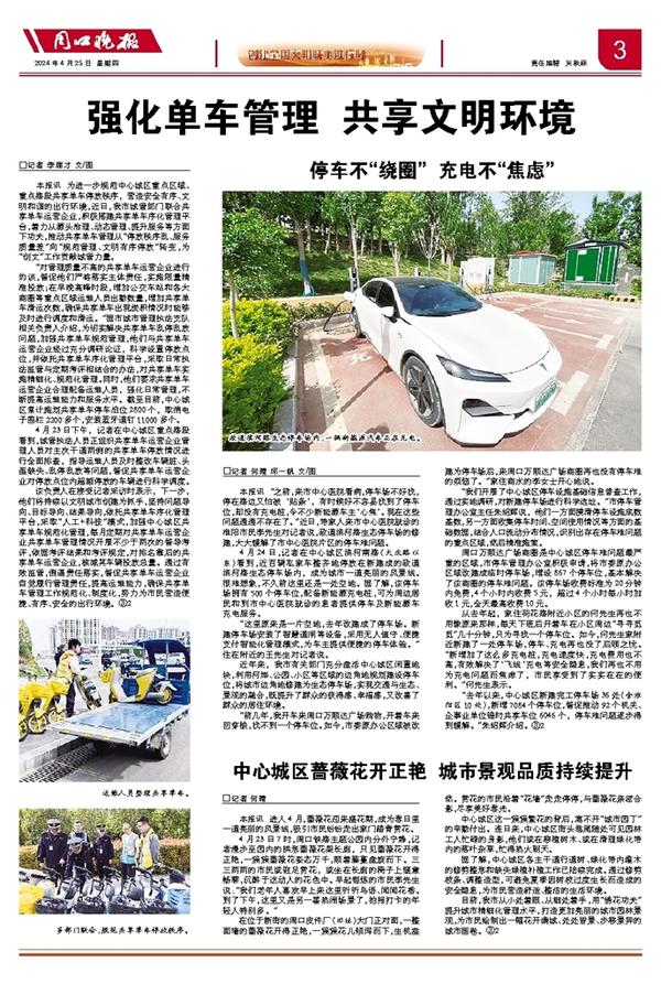 “对管理质量不高的共享单车运营企业进行约谈,督促他们严格落实主体责任,实施限量精准投放;在早晚高峰时段,增加公交车站和各大商圈等重点区域运维人员出勤数量,增加共享单车清运次数,确保共享单车出现淤积情况时能够及时进行调度和清运。”据市城市管理执法支队相关负责人介绍,为切实解决共享单车乱停乱放问题,加强共享单车规范管理,他们与共享单车运营企业经过充分调研论证,科学设置停放点位,并依托共享单车序化管理平台,采取日常执法监管与定期考评相结合的办法,对共享单车实施精细化、规范化管理。同时,他们要求共享单车运营企业合理配备运维人员,强化日常管理,不断提高运维能力和服务水平。截至目前,中心城区累计施划共享单车停车泊位2800个,取消电子围栏2200多个,安装蓝牙道钉11000多个。