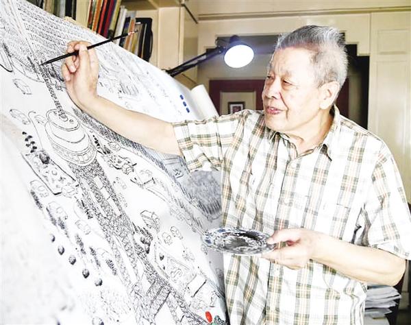 20世纪90年代初,《周口日报》创刊。我隐约记得,从那时起,一些关于周口人文历史的报道或文章,便开始引用葛庆亚的插图。到了2018年,《周口晚报》策划为葛老开设专栏《老葛画周口》,用两年时间系统发表了葛老几十年来手绘周口的画作,引起读者广泛关注,也勾起城市建设者及一些社会学家的浓厚兴趣。彼时,周口城市化进程正高歌猛进,棚户区改造步伐加快,城市面貌日新月异。老周口渐行渐远。人们对一座城市的记忆将被时间永久地封存。不少有老周口城市情结的人开始呼吁,保护和抢救周口的街区文化,传承城市历史,留住城市记忆。所幸,葛老的一双慧眼、一支妙笔,帮助我们从艺术的角度,重温这座城市的过往岁月和昔日繁华。