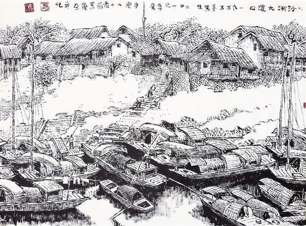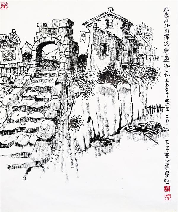 周口老城区,包括现辖的淮阳区,富有深厚的历史文化底蕴。周口老城区起源于渡口,这里三川交汇,物阜民丰,漕运、商业、手工业繁盛一时;淮阳古时称陈州,历史更为悠久,地上地下文物资源富集,这里不再赘述。城市的个性化特征,激发艺术家的创作灵感,也赋予艺术家浓郁乡愁。从20世纪60年代开始,破旧甚至贫穷的周口,那原生态的市井风情、承载历史云烟的街巷河道、奔波劳碌纯朴善良的百姓,在年轻的葛庆亚眼里,充满人间烟火气,回荡时光万花筒。他被深深地吸引了,从此一发而不可收,画笔不停,创作不辍。观葛老的画,皆为现实生活中的写生,用笔繁简相宜,或墨如烟霞,或钢钩铁划,运笔如神,妙趣横生,恰到好处,让人百看不厌。这些作品足见葛老精湛的绘画功力。从题材上看,这些画作,有河流、建筑、人物、树木、街院等,极富生活气息,体现了艺术来源生活、反映生活、服务现实的创作宗旨。现在,已到耄耋之年的葛老,还在争分夺秒、不舍昼夜,倾力创作百里沙颍河生态长廊巨幅画卷,令人感佩之至!