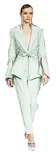 箱形西装既有双排扣款式,也有单排扣款式。箱形西装今年的变化主要体现在细节设计上,比如腰带的款式、燕尾服风格等,增添了一丝浪漫的情怀。尤其在面料的选择上,设计师更偏好采用流动感强、垂坠性好的面料,营造宽松慵懒感,打破与力量相关的硬朗、刻板印象,展现年轻时尚的气息。