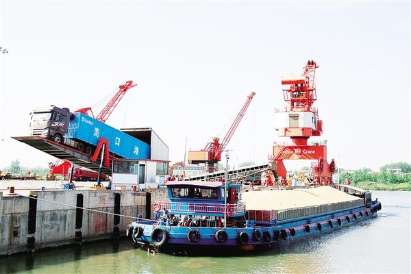 4月25日,周口港中心港区一派繁忙景象,一辆集装箱卡车正在向一艘载重2000吨的货船上运送小麦。现场工作人员介绍,一艘载重2000吨的货船,运力相当于60多辆大型卡车,且水运成本低廉,能够让生产企业大幅度降本增效。 记者 宋风 摄