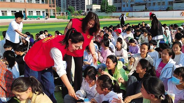 4月26日,志愿者向孩子们发放宣传册。当天,商水县“扫黄打非”办联合县新时代文明实践中心、县教体局、县公安局、东城街道办事处等单位,到希望中学开展了以“护助少年儿童健康成长、抵制有害出版物和信息”为主题的“书香商水·全民阅读”暨“护苗·绿书签”进校园活动。记者 马治卫 通讯员 叶敏 摄