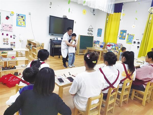 一名医护人员为幼儿园教师演示海姆立克急救法。为切实保障幼儿身心健康和生命安全,预防和减少幼儿意外伤害的发生,提升幼儿园教师应对意外伤害的处理能力和急救能力,近日,周口骨科医院小儿骨科健康宣教小组走进川汇区东成幼儿园开展急救培训。③2记者 郑伟元 摄