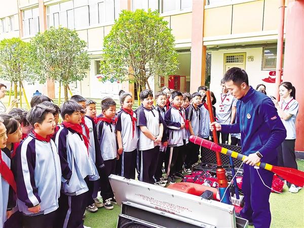 5月11日上午,全市教体系统防灾减灾宣传活动周在周口市纺织路小学启动。图为该校学生在消防救援人员的指导下,学习消防知识,了解消防器材性能。记者 刘华志 摄