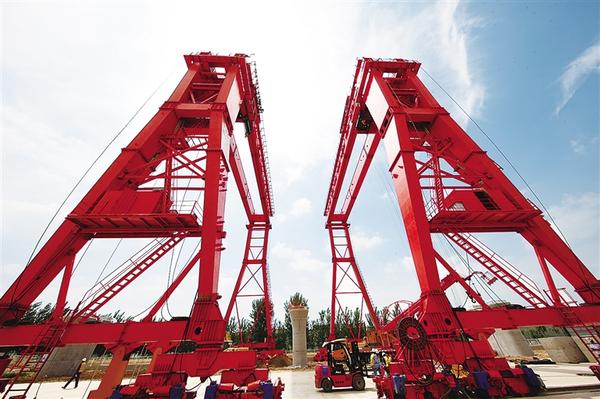 5月21日,平漯周高铁川汇制梁场900T跨线提梁机主框架组装完成,工人正安装调试索具和钢丝绳,为由中铁七局承建的平漯周高铁站前八标项目首孔箱梁的架设提供有力保障。平漯周高铁站前八标项目全长24.198公里,途经商水县、西华县、川汇区、淮阳区、市城乡一体化示范区。记者 刘俊涛 摄