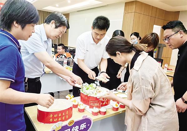 5月20日,在周口青网科技园,有关领导为这里的企业员工分发生日蛋糕。当天,省总工会第三蹲点工作组、市总工会联合中原众恒集团工会,在周口青网科技园为新就业形态劳动者过集体生日,提升他们的获得感、幸福感、归属感。记者 王晨 摄