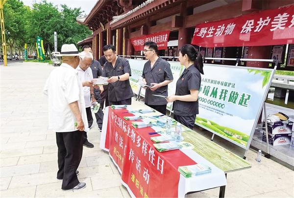 5月22日,法院干警向群众宣传相关法律知识。当日是第24个国际生物多样性日,为充分发挥环境资源审判职能作用,提升全社会生物多样性保护意识,周口市中级人民法院联合淮阳区人民法院在淮阳区苏子读书园开展法治宣传活动。③2通讯员 苏畅 摄