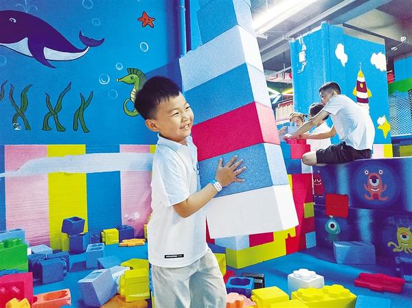 5月25日,一名儿童在某室内儿童游乐园里开心玩耍。天气越来越热,中心城区室内儿童游乐园成了孩子们玩耍的好去处。这些游乐园里,海洋球池、蹦蹦床、滑滑梯等设施一应俱全,部分游乐园还设置了电玩体验区。 记者 窦娜 摄