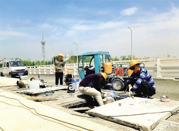 5月28日中午,炎炎烈日下,几名工人在周口中心城区七一路东延工程沙颍河引桥路段紧张施工。据了解,七一路跨沙颍河大桥是七一路东延工程的重要组成部分,其引桥附属设施的正常使用尤为重要,目前工人正在完善引桥的附属设施。记者 沈湛 摄