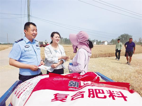 5月29日,西华县公安局大王庄派出所民警在帮助村民收麦。连日来,西华县公安局组织警力深入田间地头,多措并举做好保障工作,护航“三夏”,确保夏粮颗粒归仓。任君箫 摄