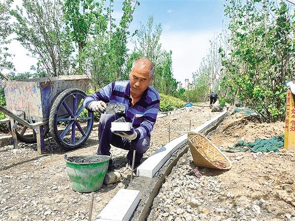 5月28日,一名工人在修葺红旗四路人行步道。近年来,我市在中心城区道路建设上加大投入力度,构建便民快速路,升级改造旧城路,打通梗阻断头路,让中心城区路网结构更加完善,片区连接更加紧密,城市配套更加共享,市容市貌更加出彩。红旗四路位于临港开发区境内,北起滨河南路,南至交通大道,目前正在抓紧施工中,道路通车后将有效缓解交通压力,方便市民出行。 记者 沈湛 摄