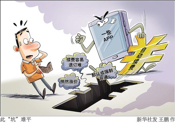 “当初同意自动续费,是为了消费更方便、更划算,没想到‘暗坑’这么多。”安徽合肥市民刘旭斌说。和刘旭斌一样,不少消费者感叹,APP自动续费容易退订难。