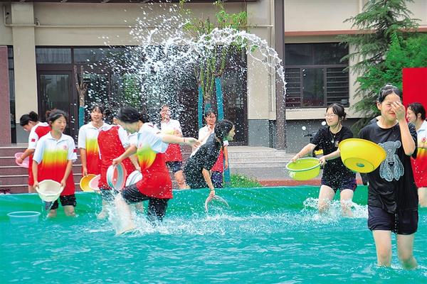6月5日,周口颍河高级中学的高三学生在校园广场泼水狂欢。为让高三学子释放考前压力,调整状态,以更加积极的心态迎接高考,连日来,我市各学校在校园内举行释放自我的减压赋能活动。记者 王吉城 摄